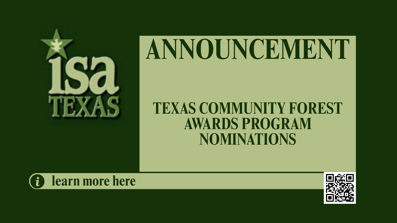 Submit a Nomination The Texas Tree Awards Program celebrates the accomplishments of those who have dedicated their talents to the protection, planning, and proliferation of their Texas community forest canopy. Award nominations must be received no later than Sunday, July 13, 2025, at 11:59pm (CT). This program is open to anyone who has a role in building stronger Texas communities